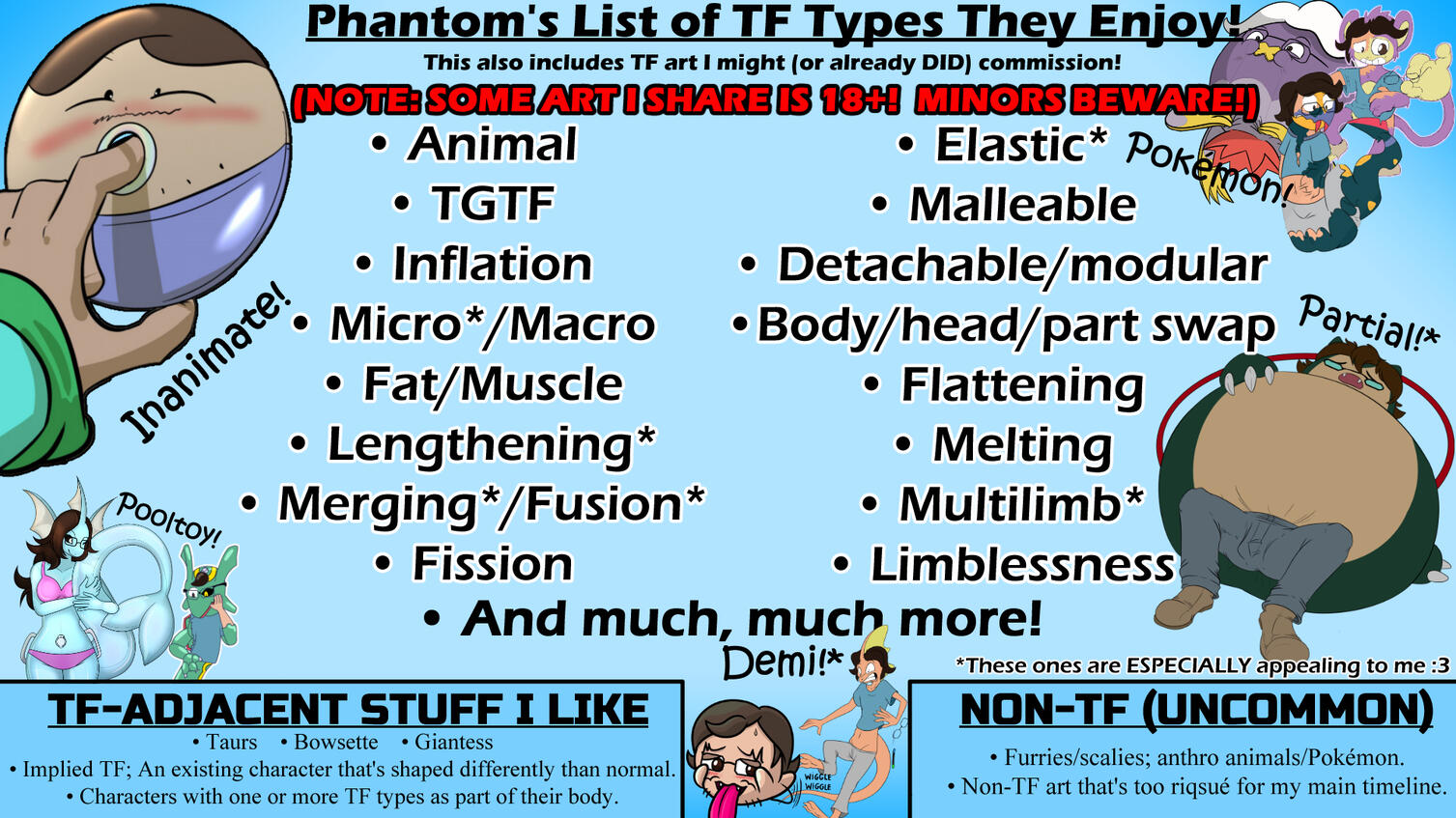 Hi! My name is PhantomTF. I love commissioning (mostly) SFW transformation (TF) artwork, and sharing others' TF art!I'm on 4 social media sites above. Follow me on Twitter or Bluesky for a feed of others' TF art, and follow me on DeviantArt or FurAffinity to see my own commissioned TFs!WARNING: Some art shared or favorited by me on these sites may have 18+ elements! Minors beware!Scroll to the bottom to see a sample of my own TFs!